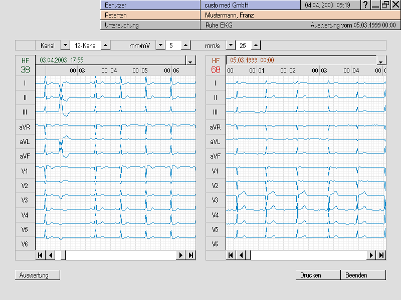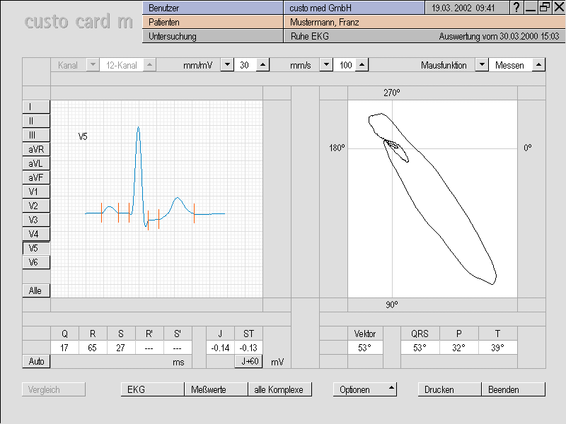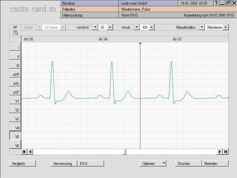 Důležitým předpokladem pro precizní EKG záznam vyšetřovaného pacienta a jeho pozdější zpracování je zobrazení a analýza klidového nebo zátěžového EKG. Přitom samozřejmě důležitou roli hraje i kvalita a úroveň vzorkování a rozpoznávání EKG signálu. Vlastní modul EKG Custo Card M obsahuje vysoce jakostní EKG-zesilovač jehož parametry a konstrukce zaručují pořizování EKG záznamů na klinické úrovni.