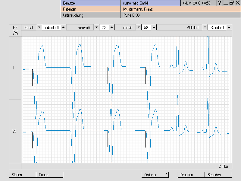 Během pořizování EKG vyšetření je na PC monitoru zobrazováno reálné a časově synchronní EKG snímaného pacienta. Počty zobrazovaných kanálů, rychlost i amplituda snímání, ale i rozpoznávání stimulačních pulsů nebo akustická signalizace QRS komplexů jsou plně volitelné a kdykoliv přestavitelné. Optimální kontrola stimulačních pulsů je při zobrazení svodů II a V5 s amplitudou 30 mm/mV a rychlostí posuvu 50 mm/s obzvláště efektivní. Pomocí integrované funkce PAUSA lze EKG na monitoru kdykoliv pro kontrolu zastavit a popřípadě i uložit jako doplňující episodu ke konečnému záznamu, lze ji samozřejmě i vytisknout odděleně. Kromě použití standartních svodů, lze EKG registraci provést i za použití NEHBových nebo CABRERA svodů.