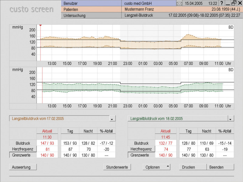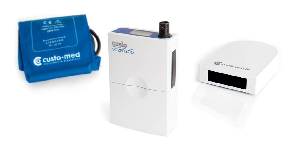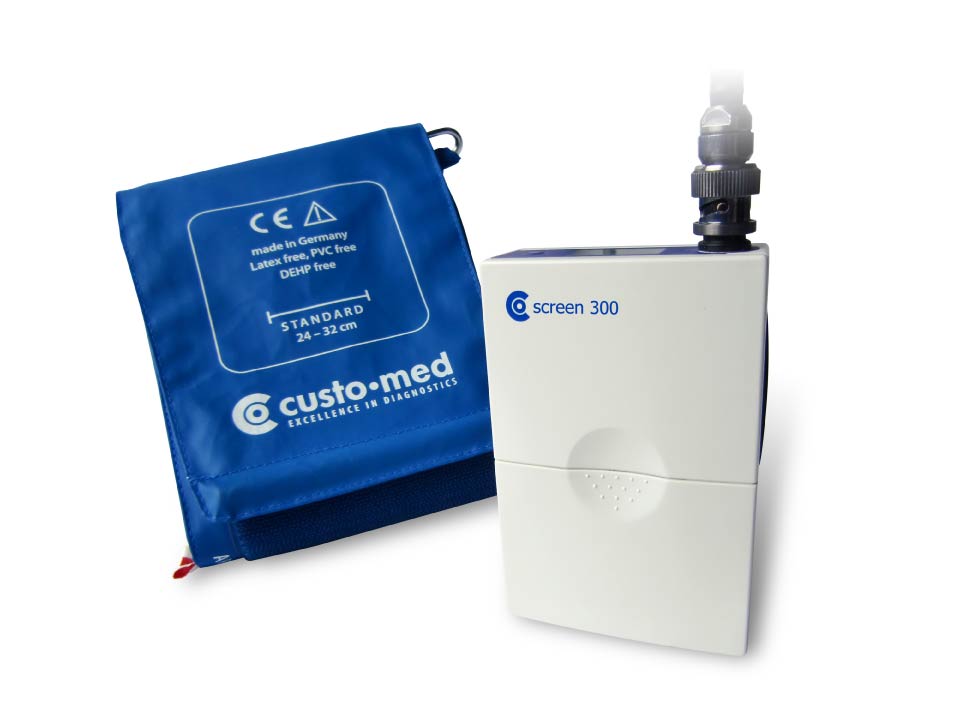 Vyšetřování krevního tlaku již nemá budoucnost v jeho měření ve zvláštních podmínkách ordinace, ale orientuje se na skutečný krevní tlak pacienta v každodenním životě, tím že dosáhne dokonalého obrazu o krevním tlaku sledovaného pacienta. Každá jednotlivá hodnota může být považována pouze jako příslušný aktuální stav. Ambulantní 24 hodinové měření krevního tlaku však vytváří rozsáhlý profil chování krevního tlaku. Zejména podrobné určení rozdílové hodnoty TK mezi denní a noční fází, se jeví jako přínosné pro kontrolu zvolené terapie a diagnozy. Systémová variace Custo Screen je svým komplexním řešením a individuálním přizpůsobením určená nejen pro klinické ale i ambulantní využití. K dispozici je nyní zcela nový diagnostický program od firmy Customed GmbH, pracující na běžně používaných PC, jenž zajistí snadné naprogramování monitorovacího záznamníku, praktickou dokumentaci, optimálníarchivaci v databázi a veškeré další operace spojené s kvalitní diagnostikou TK. Datová komunikace využívá moderního bezdrátového spojení pomocí datového komunikátoru Custo COM USB, vlastní měření je založeno na oscilometrické metodě s automatickou korekcí nulové hodnoty. Modernizovaný záznamník Custo Screen 300 se vyznačuje zejména nově konstrukčně řešeným a daleko spolehlivějším kompresorem a teplotně nezávislým tlakovým senzorem než předešlé modely. Záznamník se tak stává lehčí, tišší, rychlejší a jeho provoz ještě spolehlivější.