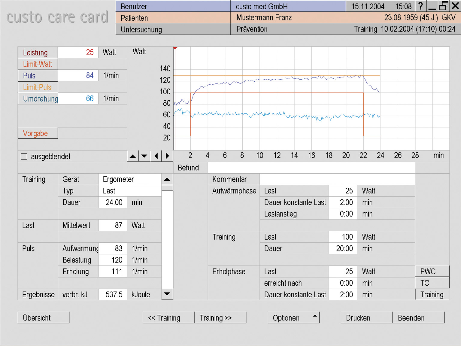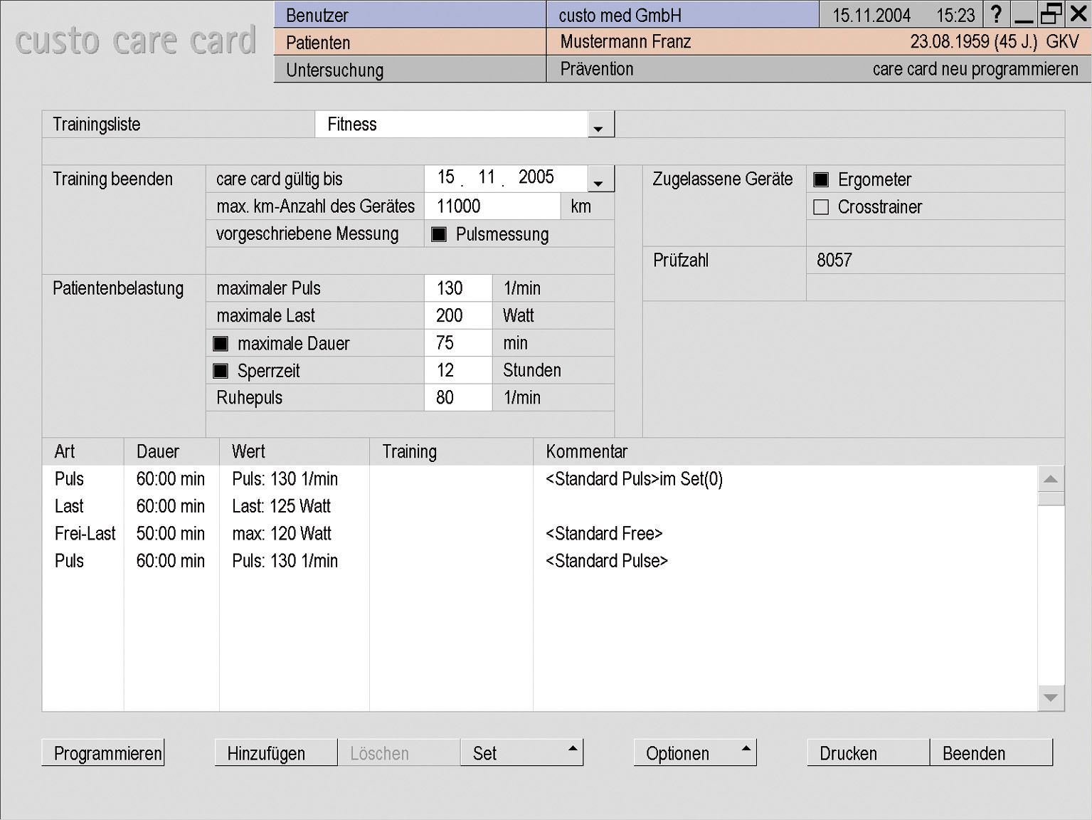 Díky možnosti programování Custo Care Card vytvoříte individuální cvičební profil, který je zaznamenán na paměťovou kartu. Poté pacient používá Custo Care Card namísto předpisu. Podle právních předpisů je Custo Care Card chráněna proti neautorizovanému přístupu k údajům o pacientovi. přijde do vaší ordinace. Provedete počáteční vyšetření za pomoci EKG a stanovíte tak funkční kapacitu, houževnatost a zátěžové intervaly. Tím bude zaručen optimální cvičební výkon pro vašeho pacienta.